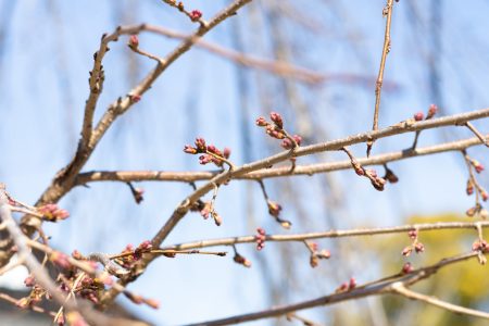 いつも開花が早い「家老屋敷跡」のしだれ桜もまだまだ蕾ですが、こちらは少しピンクに色づいています。
