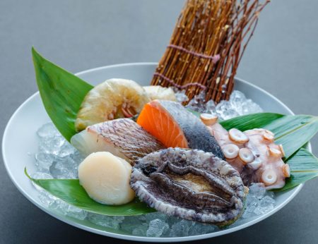 海の幸5種の鉄板焼(オニテナガエビ・鯛・サーモン・帆立貝柱・蛸)